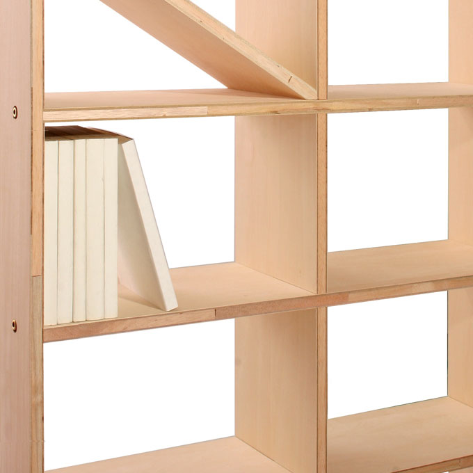 嵌合方式による強固な構造、本の重さで棚板がたわみにくい。