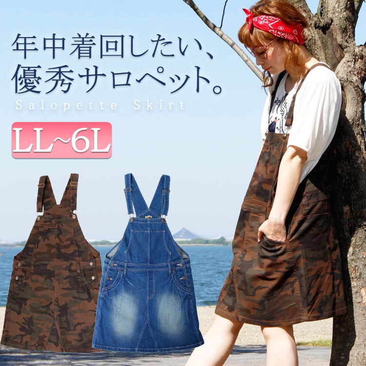 サイズXL(LL),XXL(3L),XXXL(4L),XXXXL(5L),XXXXXL(6L),実寸(cm)XL(LL)総丈 94cm ウエスト 51cm ヒップ 55cm 裾幅 61cm 肩紐丈 45.5cm スカート丈 45cm2XL(3L)総丈 96cm ウエスト 54cm ヒップ 58cm 裾幅 64cm 肩紐丈 49.5cm スカート丈 45cm3XL(4L)総丈 99cm ウエスト 58cm ヒップ 62cm 裾幅 68cm 肩紐丈 49.5cm スカート丈 46cm4XL(5L)総丈 101cm ウエスト 62cm ヒップ 66cm 裾幅 72cm 肩紐丈 50.5cm スカート丈 46cm5XL(6L)総丈 104cm ウエスト 67cm ヒップ 71cm 裾幅 77cm 肩紐丈 52.5cm スカート丈 47cm素材綿 98% ポリウレタン 2%備考こちらのサイズ表記は平置き採寸のサイズです。