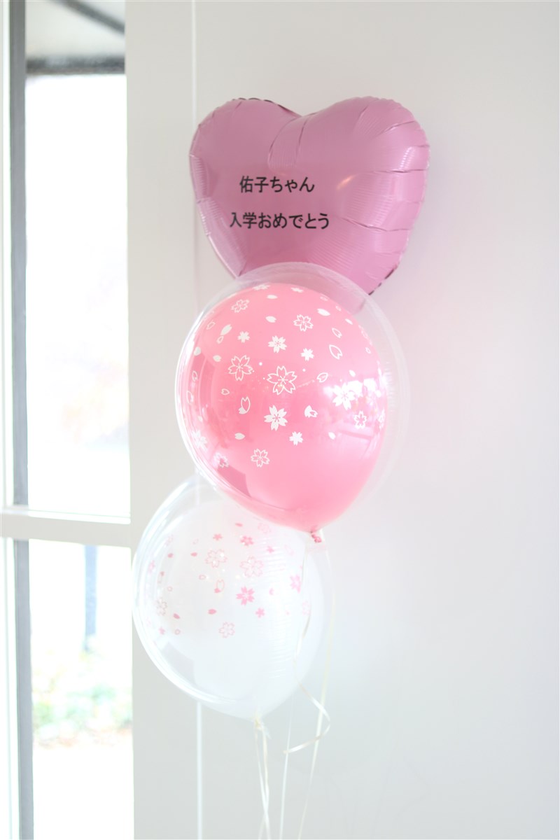 桜の花びらが舞い散ちる、春らしいバルーンアレンジ 桜柄の風船が4つのアレンジになります 卒業・入学の贈物や、春に挙式をされる方への電報バルーンにオススメです さくらバルーンと一緒に記念撮影されると、ぐっと春らしい雰囲気になりますよ トップのピンクのハートバルーンにメッセージをお付けできます。